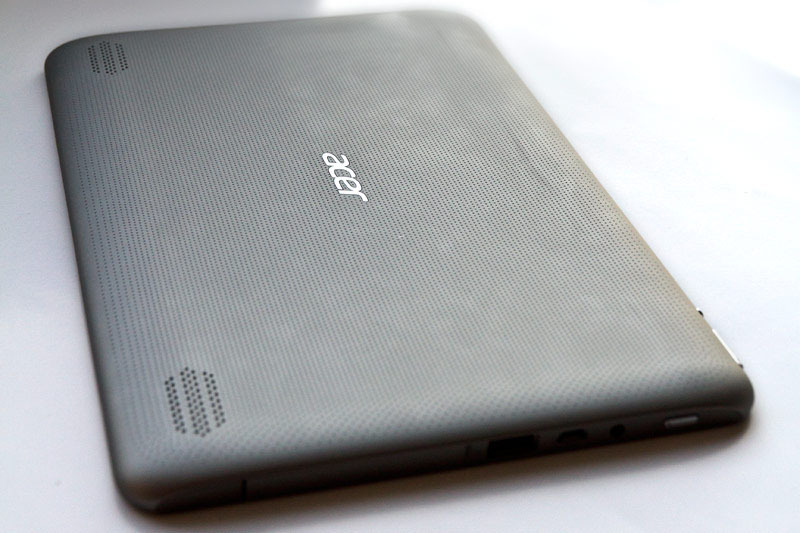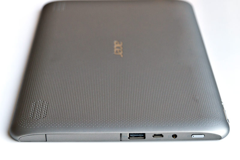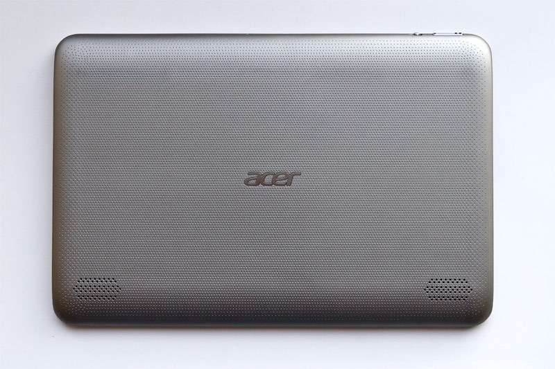 Внешне планшет практически идентичен другим устройствам линейки – A701 и A511. Его задняя крышка выполнена из аналогичного бархатистого пластика soft-touch и него такие же посеребрённые пластмассовые накладки на левом и правом торцах, как у предыдущих моделей. Главные отличия, которые позволяют идентифицировать в планшете именно A211, это отсутствие камеры на задней крышке, другая форма динамиков и несколько иное расположение разъёмов: microUSB и порт USB 2.0, от которого отказались в A511/A701, располагаются на левом торце. Справа находится разъём для зарядки, который также сохранился (в A701 для зарядки используется microUSB). Там же располагается заглушка, под которой находятся порты для карты памяти формата microSD и SIM-карты. На верхнем торце остались качелька громкости и рычаг блокировки автопереворота дисплея.
