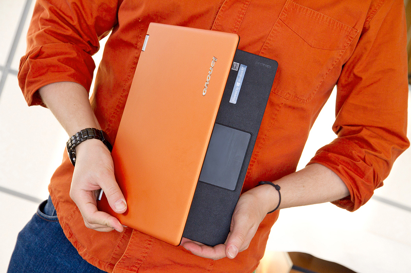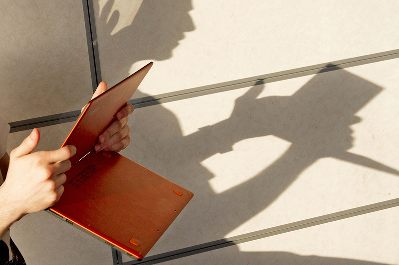 Внешне планшет полностью идентичен Yoga 13, и с первого взгляда их легко перепутать. Корпус покрыт приятным на ощупь прорезиненным материалом, причём это касается не только верхней крышки, но и дна. Внутри покрытие сделано из "бархатистого" каучука, стилизованного под кожу.