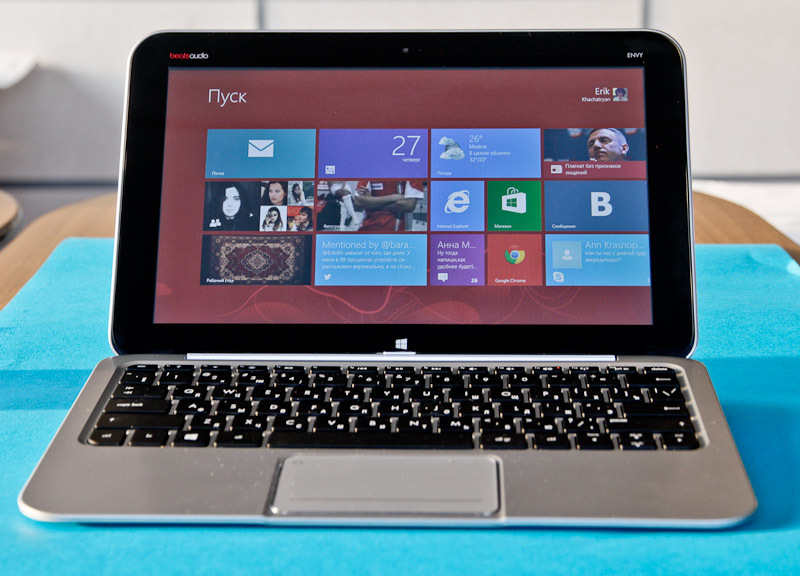 Сам корпус устройства выполнен из алюминия (кроме панели, обрамляющей клавиатуру — там посеребрённый пластик), и благодаря этому Envy x2 очень приятен на ощупь.