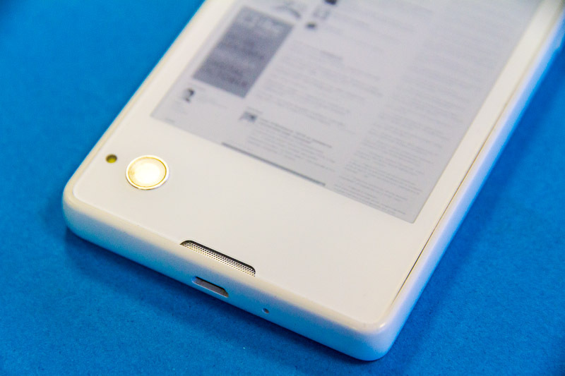 Второй дисплей смартфона, распложенный на задней крышке, сделан, как это неоднократно было сказано, по технологии электронных чернил. В отличие от основного, e-Ink экран не восприимчив к нажатиям, и все взаимодействия с ним происходят посредством собственной сенсорной панели, аналогичной той, что используется под основным дисплеем. Жесты также схожи: двойное нажатие переключает запущенное приложение, а "листание" влево и вправо позволяет переходить к следующей странице или изображению. На него же можно выводить нужную информацию, которая, благодаря технологии электронных чернил, останется на экране даже при полной разрядке аккумулятора смартфона. Основная же цель второго дисплея (кроме комфортного чтения) — вывод на него дополнительной информации и уведомлений, что должно сэкономить заряд батареи.