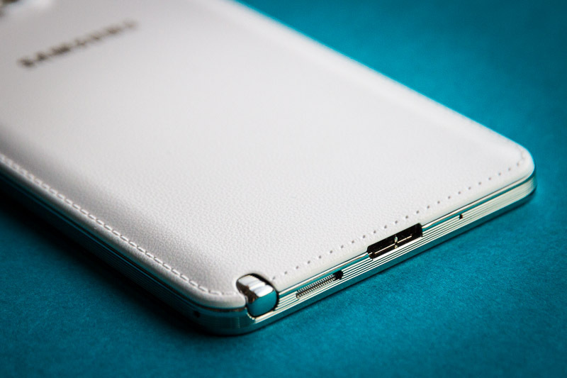 Внешне разницы между Galaxy Note II и Galaxy Note 3 (в третьем поколении компания решила перейти к нумерации арабскими цифрами) почти нет — примерно так же, как между Galaxy S3 и Galaxy S4. Серебристая окантовка вокруг смартфона перестала быть округлой, и теперь лицевая панель и торцы находятся под прямым углом по отношению друг к другу (аналогично с Galaxy S4). Самые большие изменения во внешнем виде произошли с задней крышкой. Она больше не глянцевая, а сделана из бархатистого пластика soft-touch с фактурой под простроченную кожу. Причём на аппаратах белого цвета этот пластик более жёсткий на ощупь, чем на чёрных Galaxy Note 3.