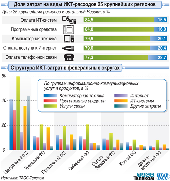 ТАСС–Телеком подготовил рейтинг российских регионов и федеральных округов по расходам корпоративного сектора на информационные и телекоммуникационные продукты и услуги в 2010 году. Распределение ИКТ-расходов неравномерно и концентрировано — доля 25 крупнейших по корпоративным затратам регионов составляет от 77,3% до 84,5% в общем объеме расходов.