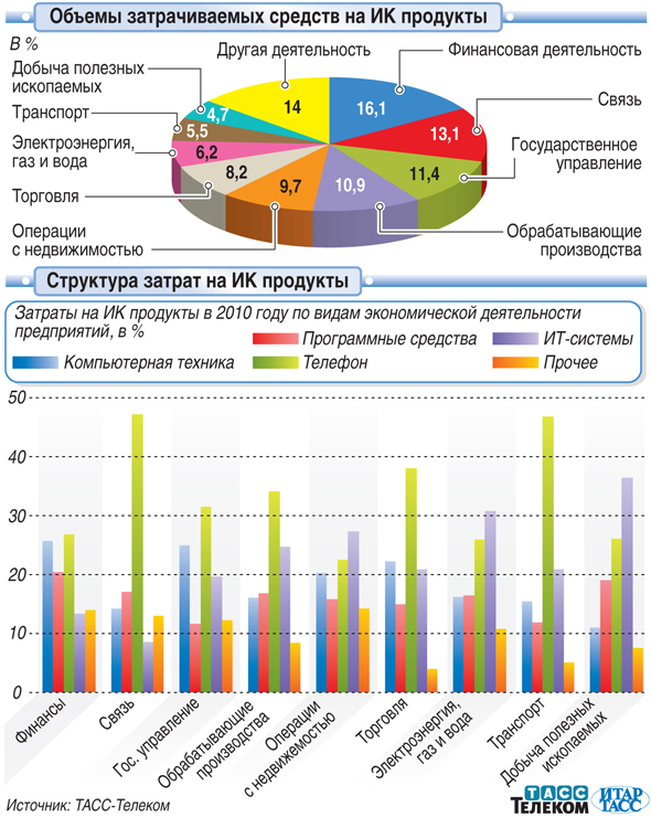 ТАСС–Телеком подготовил рейтинг российских регионов и федеральных округов по расходам корпоративного сектора на информационные и телекоммуникационные продукты и услуги в 2010 году. Самой большой статьей ИКТ–расходов являются затраты на телефонную связь, меньше всего компании тратят на оплату доступа в Интернет.