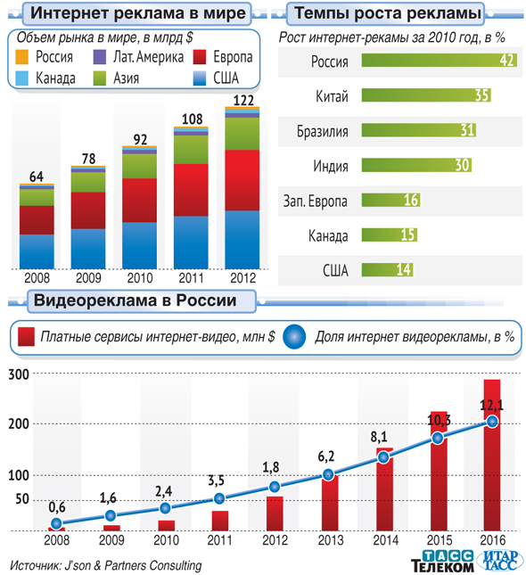 Компания J’son & Partners Consulting представила результаты очередного исследования российского и мирового рынков онлайн-ресурсов с видеоконтентом. Аналитики компании прогнозируют увеличение доли видеорекламы на рынке интернет-рекламы в России до 12% или 280 млн долларов к 2016 году.