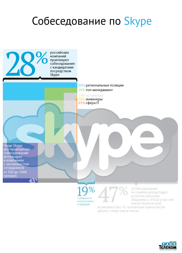 Исследовательский центр рекрутингового портала Superjob.ru выяснил, что собеседования с кандидатами посредством Skype практикуют 28% российских компаний.