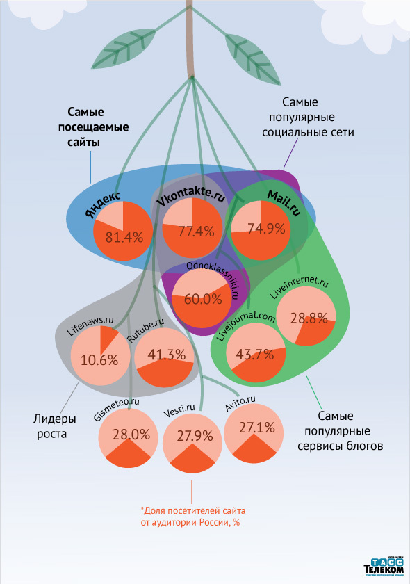 Аналитической группой ТАСС-Телеком в сотрудничестве с исследовательским центром TNS Россия подготовлен рейтинг популярности сайтов Рунета.