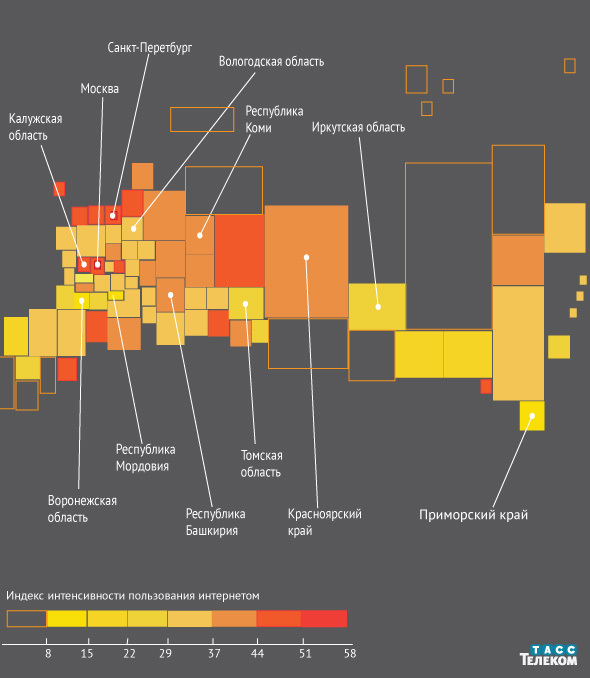 Фонд "Общественное мнение" провел исследование российской Интернет-аудитории. Как отмечают социологи, проникновение Интернета в России очень неоднородно. Так, в Сеть выходят 68% жителей Москвы, 67% жителей Санкт-Петербурга и только 29% жителей Республики Тыва. Средний уровень проникновения Интернета в России составляет 48%.