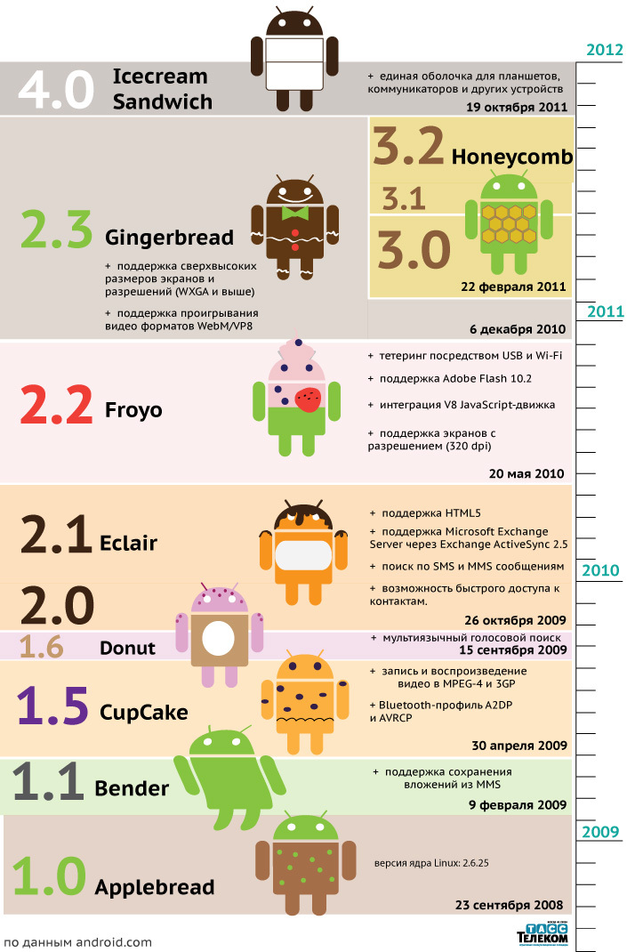 Начиная с 2008 года выпущено 10 версий операционной системы Android и ещё одна находится в разработке. Последняя версия — 4.0 "Ice Cream Sandwich" - была представлена на днях.
