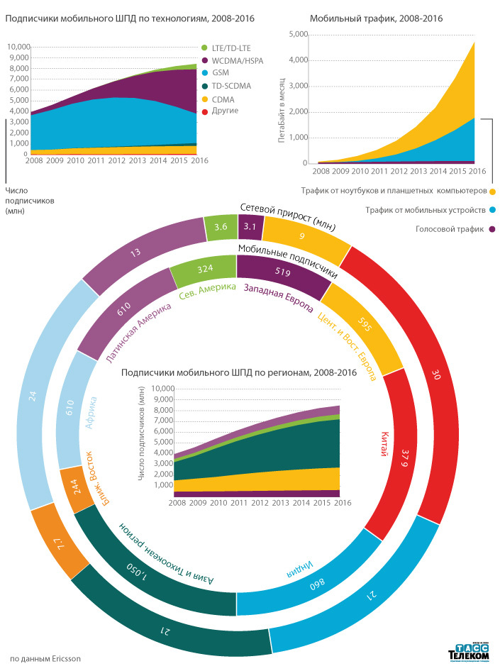 Объем трафика данных в мобильных сетях к 2016 году вырастет в 10 раз. Такой прогноз содержится в новом отчете компании Ericsson, посвященном исследованию тенденций роста трафика в мобильных сетях. Исследование базируется на результатах измерений в работающих сетях по всему миру, проводимых в течение нескольких последних лет.