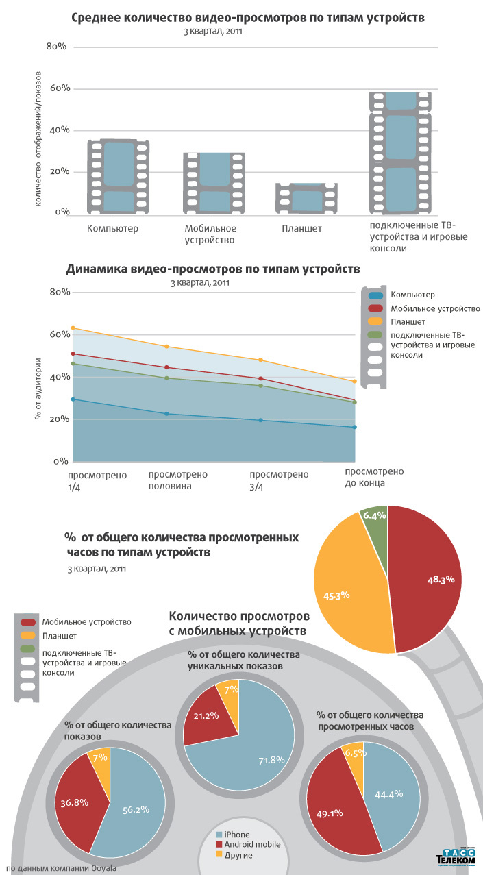 Провайдер видео-сервисов, компания Ooyala, опубликовала статистику просмотров видео в Интернете. Согласно исследованию, на планшетах сейчас просматривается больше видео, чем на обычных компьютерах.