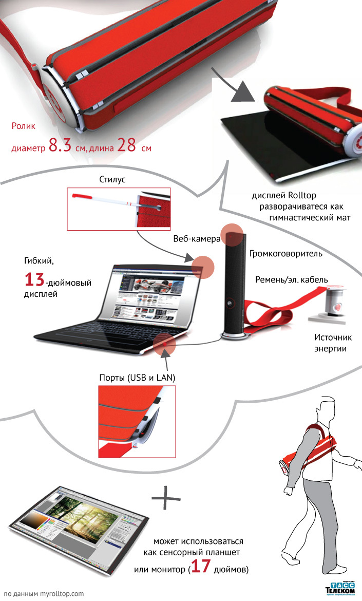 Концепция компьютера под рабочим названием Rolltop пока лишь идея. Рабочая модель Rolltop скручивается в цилиндр длиной 28 см и диаметром 8,3 см, диагональ его экрана пока составляет 17 дюймов.