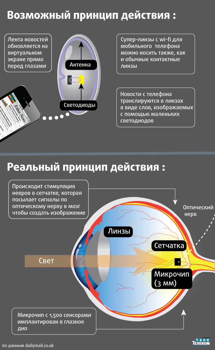 Революционные по своим свойствам контактные линзы, проецирующие изображения с компьютера прямо на глаз человека, успешно прошли испытания на животных. Разработка ученых Вашингтонского университета США и Университета Аалто в Финляндии в перспективе позволит людям читать электронную почту и другие тексты, а также "дополнять свое зрение" электронными изображениями.