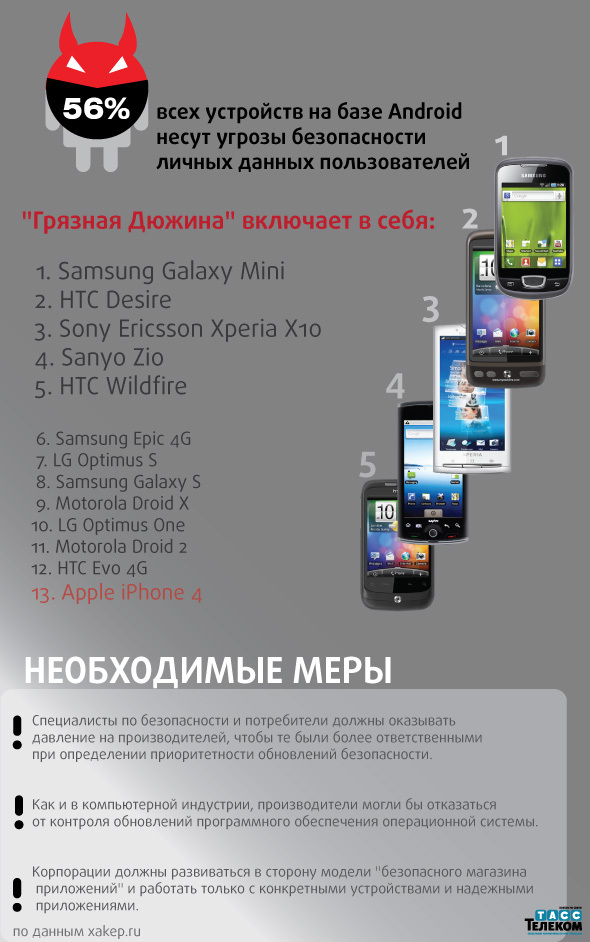 Bit9 опубликовала список наиболее уязвимых смартфонов 2011 года. В топ-12 вошли устройства только на платформе Android. На 13 месте - iPhone 4 от Apple.