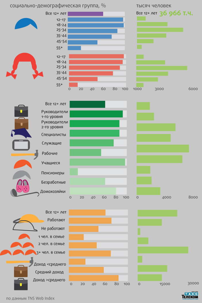 Компания TNS опубликовала ежемесячный исследовательский отчет TNS Web Index, в котором привела данные по аудитории Рунета. Статистика TNS учитывает пользователей в возрасте от 12 до 54 лет, проживающих в городах с населением более 100 тысяч человек.