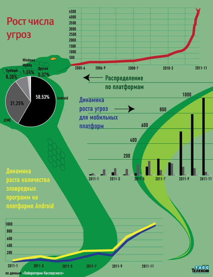 "Лаборатория Касперского" подвела предварительные итоги вирусной активности за 2011 год. В 2011 году эксперты "Лаборатории Касперского" обнаружили почти в 4 раза больше вредоносных программ для мобильных устройств, чем за предыдущие семь лет.