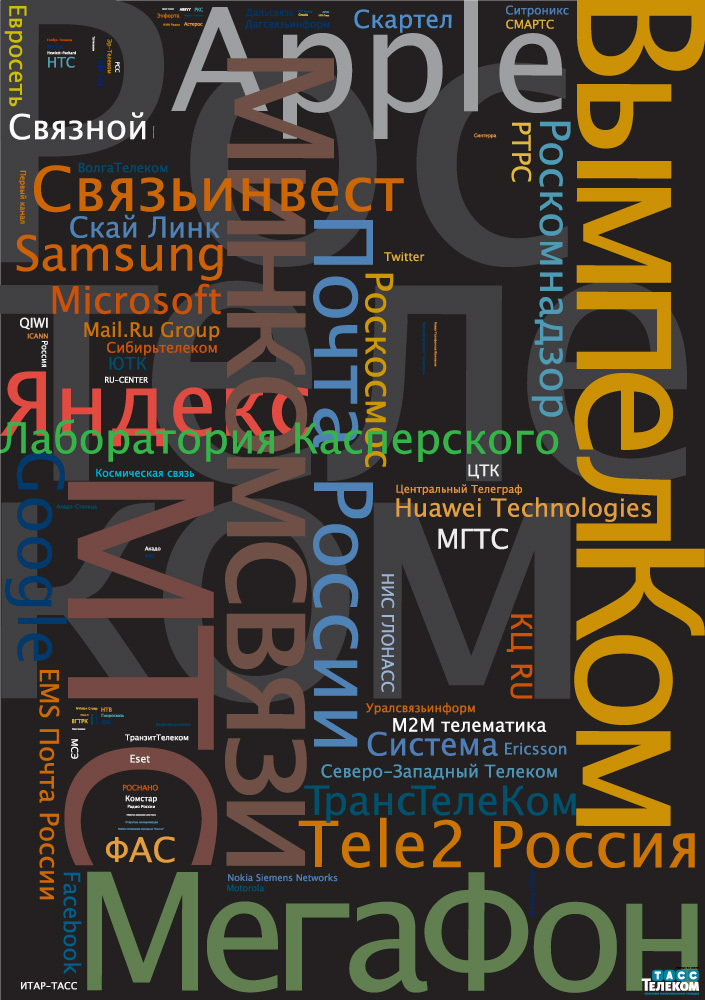 ТАСС-Телеком подводит итоги уходящего года. Мы подсчитали, какие компании и ведомства сколько раз упоминались в материалах ТАСС-Телеком. Чем крупнее шрифт, тем чаще организация упоминалась.