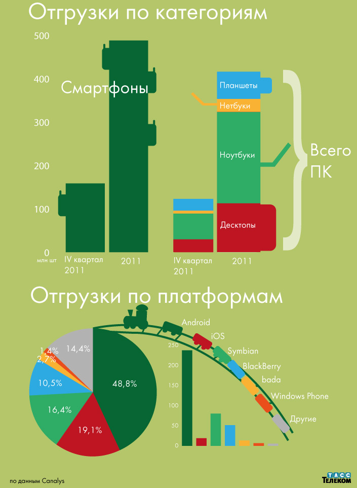 Исследовательская компания Canalys опубликовала отчет по рынку смартфонов за IV квартал 2011 года и за весь прошедший год. Впервые количество отгруженных смартфонов превысило суммарное число отгруженных компьютеров, включая нетбуки, ноутбуки и планшеты.
