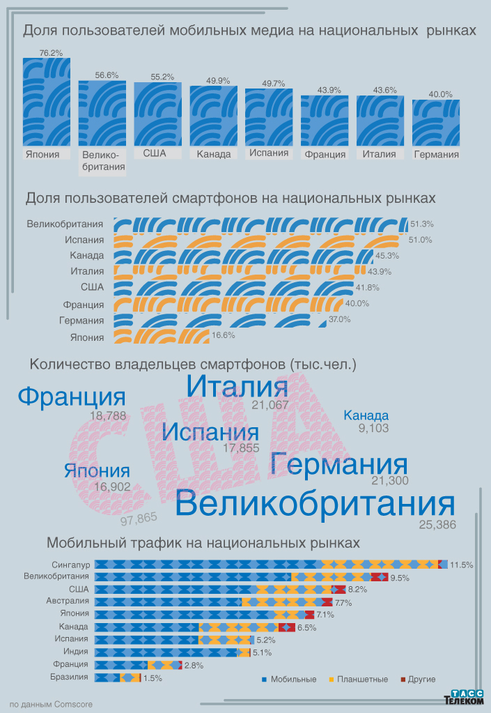 Аналитическая компания ComScore опубликовала отчет "Мобильное будущее в фокусе", в котором представила статистику мобильного трафика по странам мира.