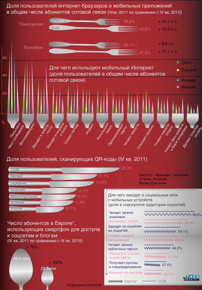 Аналитическая компания ComScore опубликовала отчет "Мобильное будущее в фокусе", в котором представила статистику по использованию мобильного интернета и данные о коммуникациях в соцсетях.