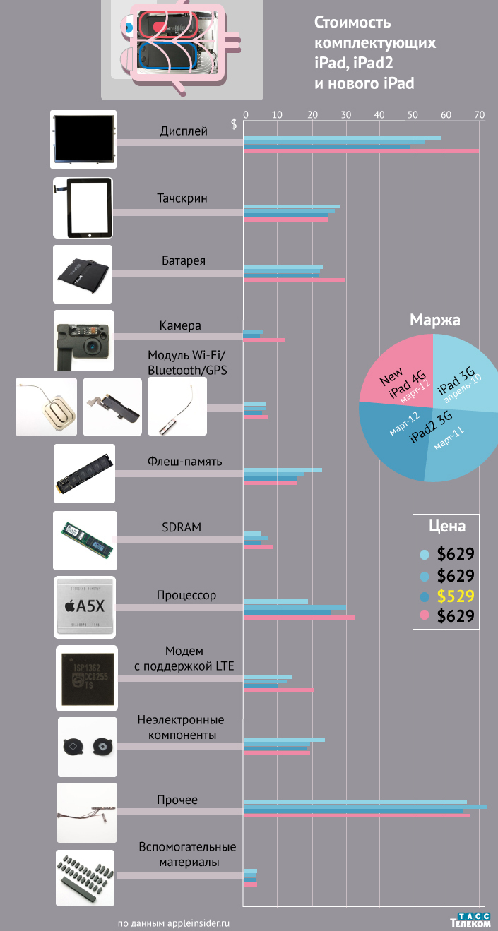 Аналитики UBM TechInsights подсчитали стоимость комплектующих планшетов iPad трех поколений.