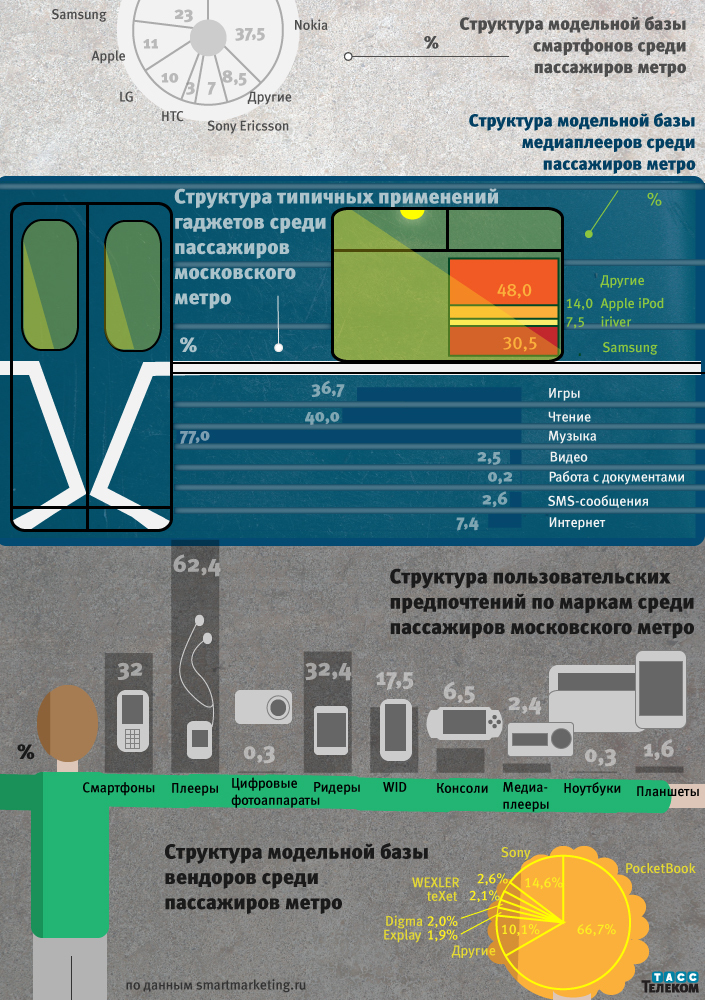 Аналитическая группа SmartMarketing подвела итоги мониторинга пользовательской базы мобильной электроники среди пассажиров Московского метрополитена.
