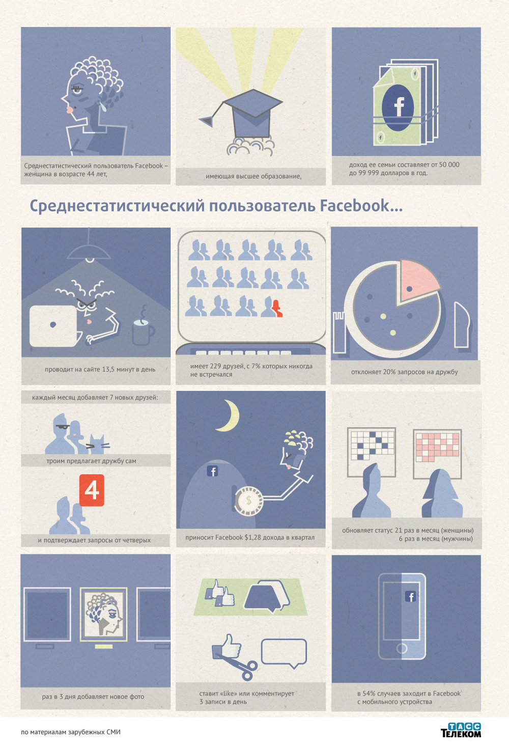ТАСС-Телеком, основываясь на данных исследований, составил портрет среднестатистического пользователя социальной сети Facebook