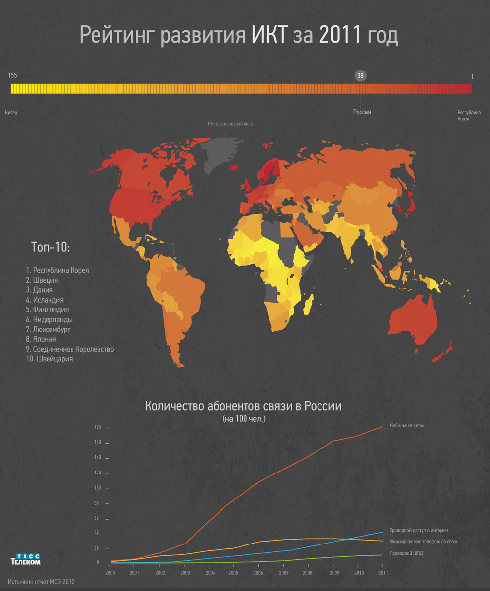 ТАСС-Телеком изучил мировой рейтинг развития информационно-коммуникационных технологий, составленный МСЭ, а также проследил динамику развития связи в России