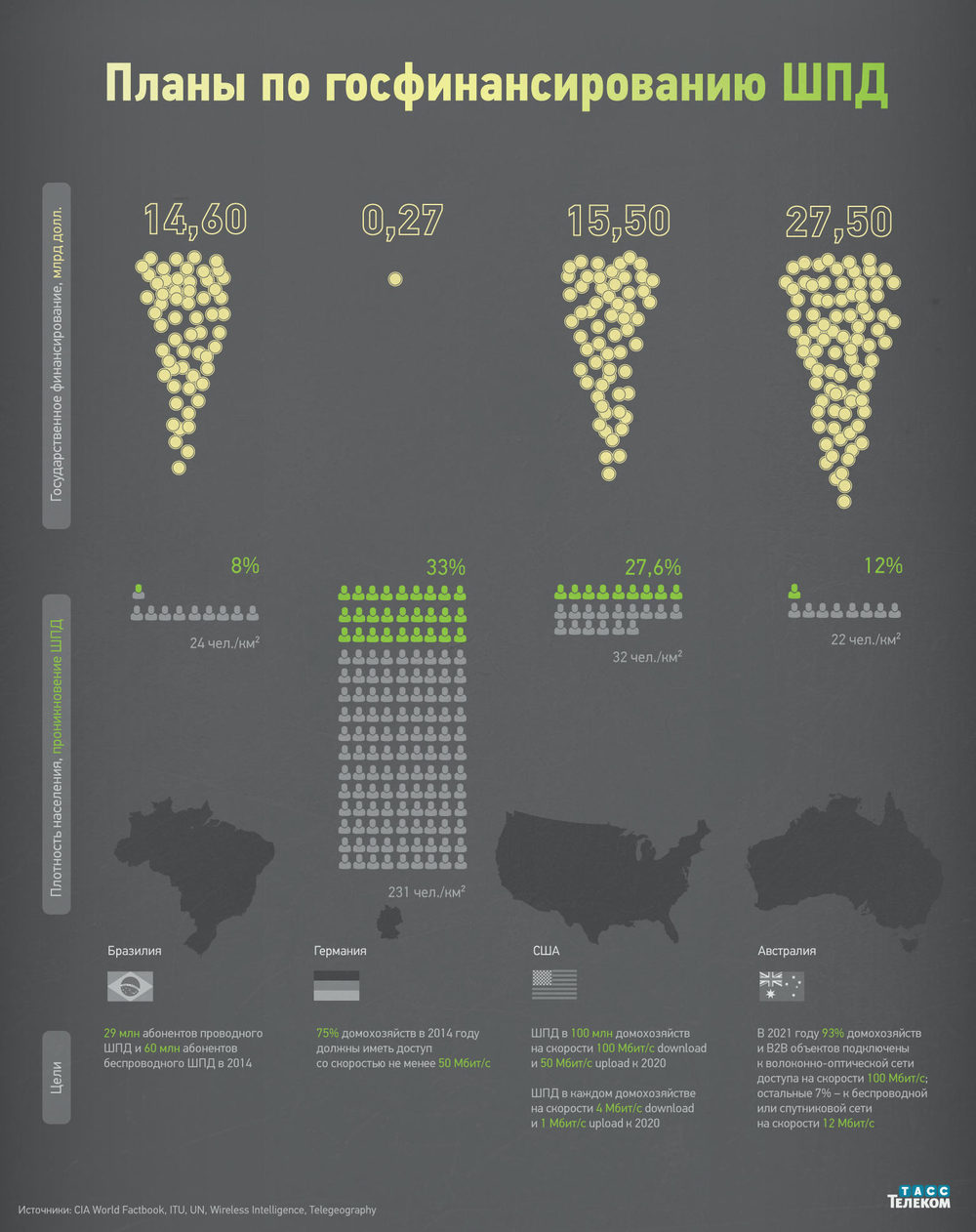 ТАСС-Телеком сравнил планы по государственному финансированию широкополосного доступа в интернет Бразилии, Германии, США и Австралии, плотность населения в этих странах, уровень проникновения ШПД, а также цели по его развитию