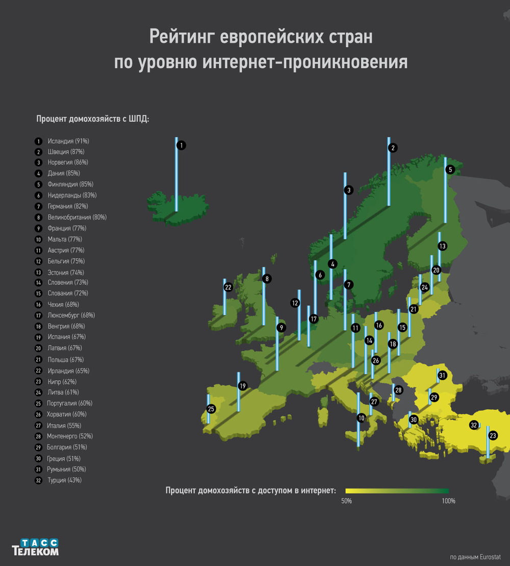ТАСС-Телеком сравнил уровень интернет-проникновения в европейских странах на основе данных Евростата