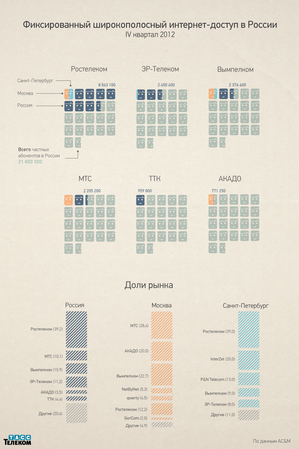 ТАСС-Телеком выделил крупнейших операторов фиксированного ШПД в России на основе данных AC&M по 4 кварталу 2012 года