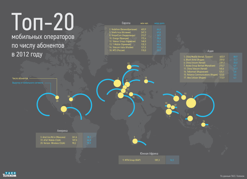 Представляем 20 крупнейших мобильных операторов мира по абонентской базе в 2012 г. по версии рейтинга ТАСС-Телеком