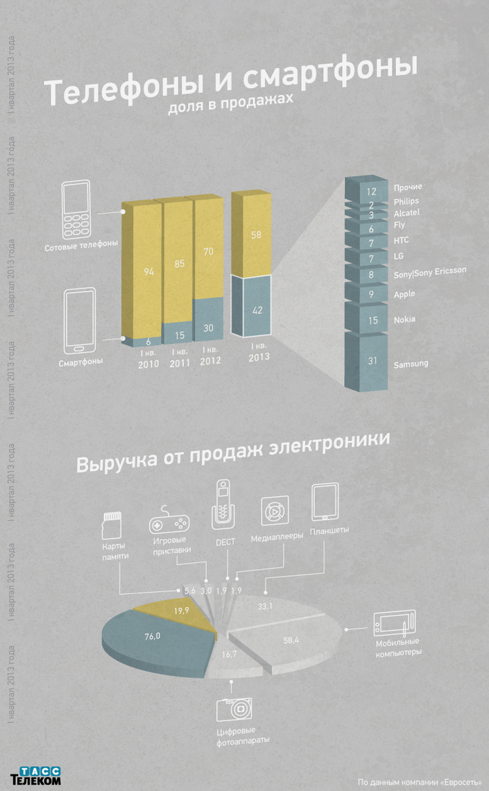 ТАСС-Телеком представляет отчёт "Евросети" по рынкам телефонов и смартфонов, мобильных компьютеров, планшетов, а также портативной электроники в России за первое полугодие 2013
