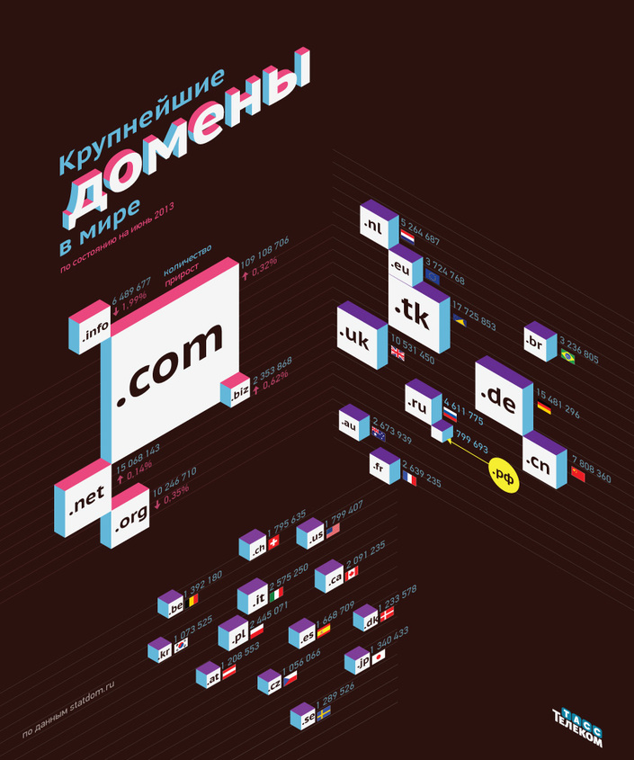 ТАСС-Телеком представляет крупнейшие интернет-домены мира по состоянию на июнь 2013 года по данным Statdom.ru