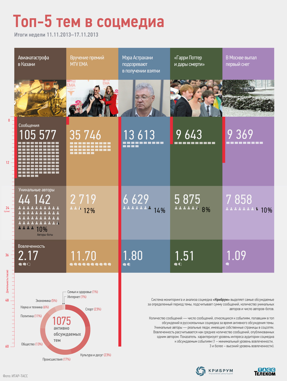 ТАСС-Телеком представляет топ-5 самых обсуждаемых в интернете тем за минувшую неделю по версии системы мониторинга соцмедиа "Крибрум"