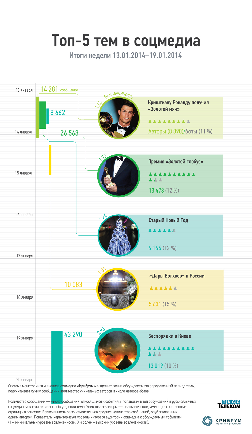 ТАСС-Телеком представляет топ-5 самых обсуждаемых в интернете тем за минувшую неделю по версии системы мониторинга соцмедиа "Крибрум"