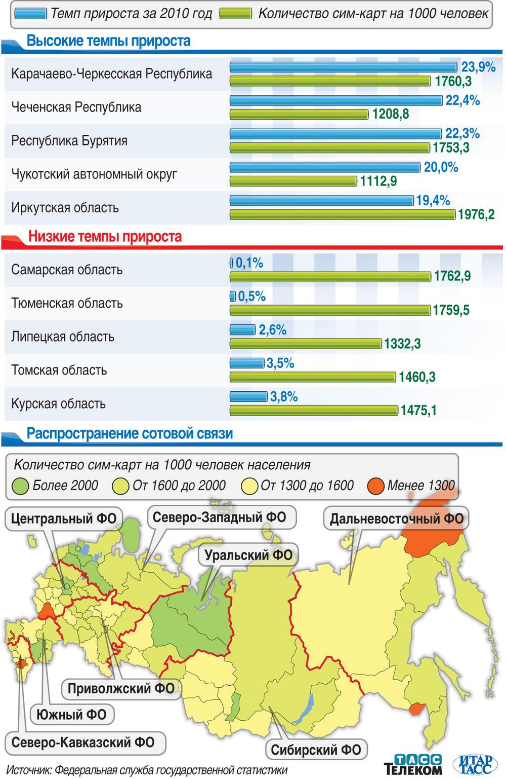 Согласно рейтингу, составленному по данным Федеральной службы государственной статистики, самые высокие темпы прироста количества SIM-карт зафиксированы в Карачаево-Черкесской Республике, самые низкие - в Самарской области