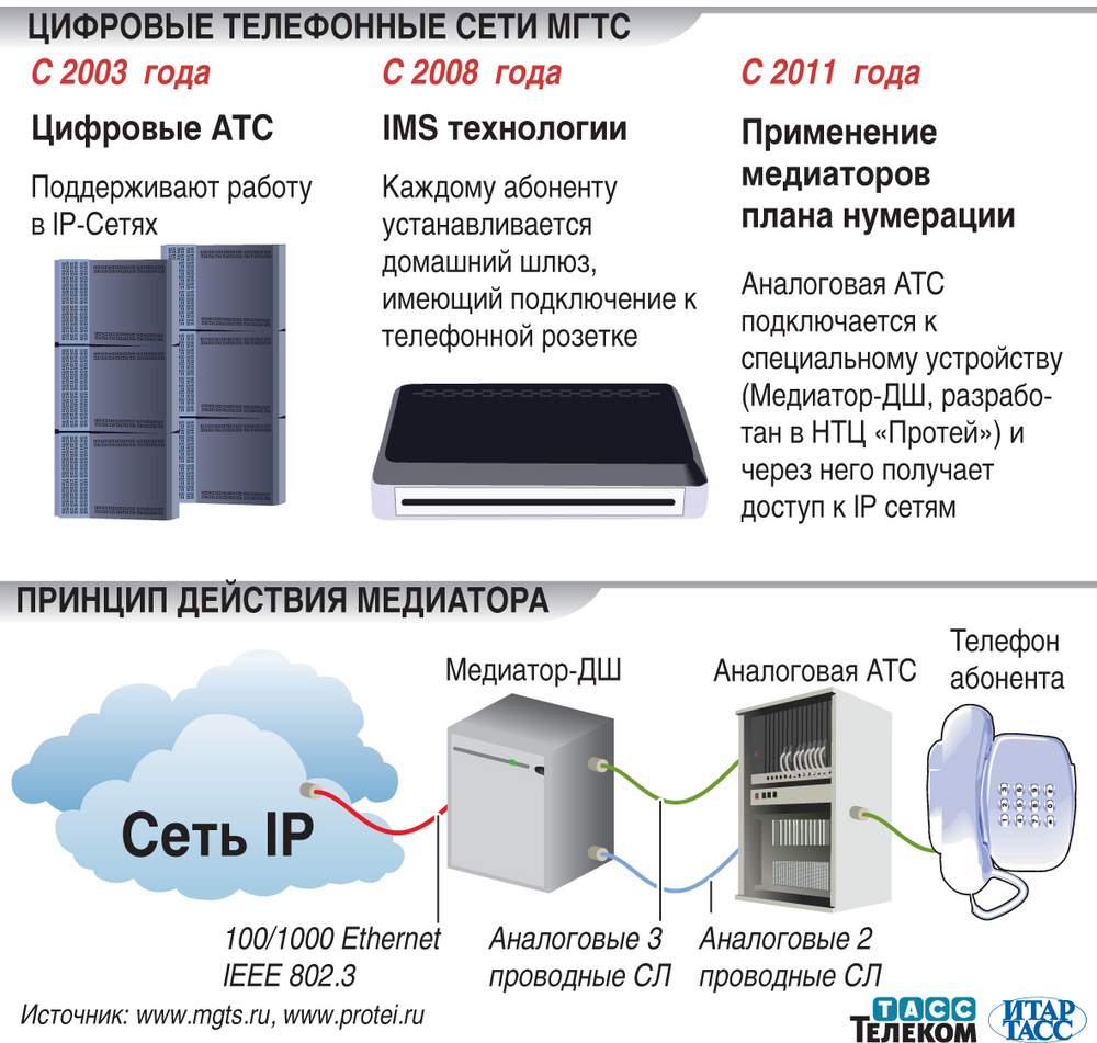 ОАО "Московская городская телефонная сеть" полностью завершит цифровизацию сети до конца 2011 года, на два года раньше запланированного срока. Завершение модернизации сети МГТС до конца 2011 года будет реализовано за счет применения медиаторов плана нумерации – специального комплекса оборудования, обеспечивающего взаимодействие аналоговых АТС с IP-сетями.