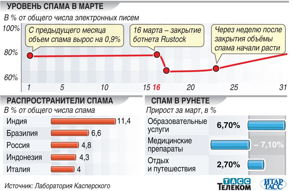 "Лаборатория Касперского" подвела итоги спам-активности в марте 2011 года, согласно которым количество нежелательной корреспонденции продолжает расти, несмотря на закрытие ботнета Rustock.
