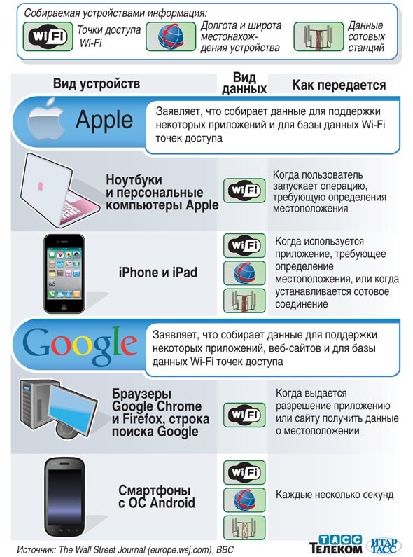 Как пишет газета The Wall Street Journal, Google Inc. и Apple Inc. собирают и хранят информацию о местонахождении пользователей мобильных устройств и компьютеров. Компании определяют примерное местоположение пользователей при помощи информации о Wi-Fi сетях и заявляют, что собираемые ими данные анонимны.