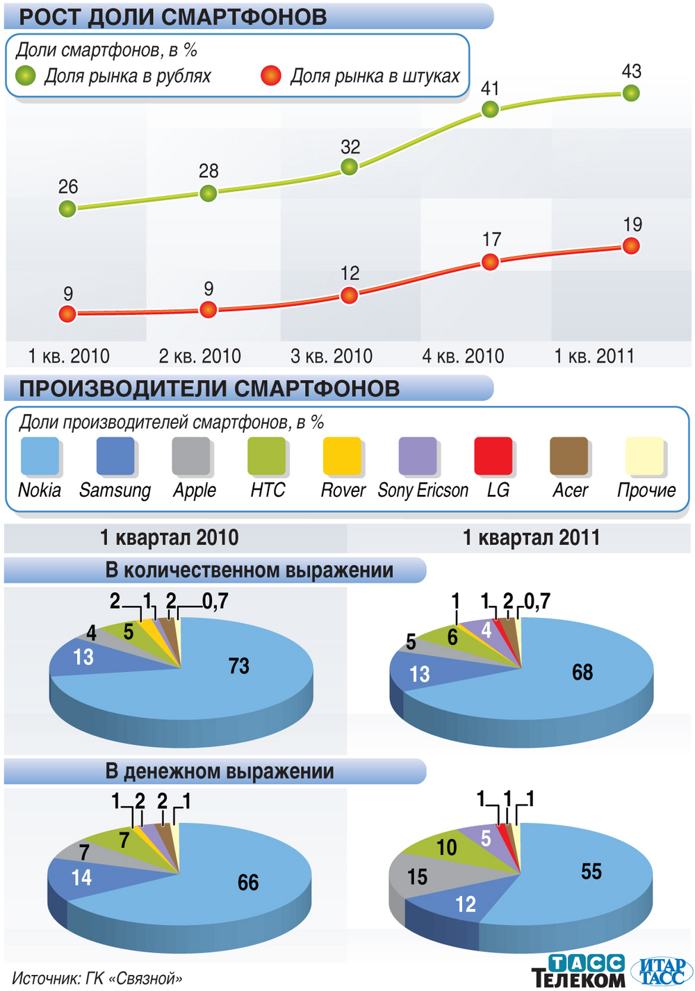 По оценкам аналитиков ГК "Связной", в денежном выражении рынок смартфонов в I квартале 2011 года составил 16,6 млрд руб. – это на 95% больше, чем за аналогичный период прошлого года.