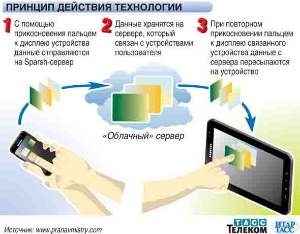 Передача данных осуществляется через "облако" при помощи нажатия пальцем на сенсорные дисплеи устройств.