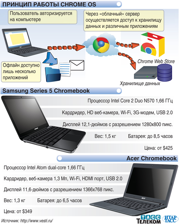 На конференции "I/O" компания Google продемонстрировала два ноутбука под управлением операционной системы Chrome OS. У обоих компьютеров нет жестких дисков, а есть только 16-гигабайтный SSD-накопитель для хранения медиафайлов.