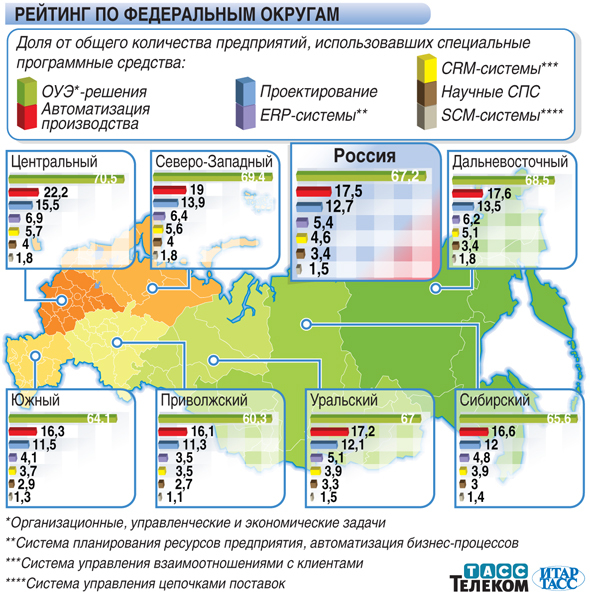 Аналитической группой ТАСС-Телеком подготовлены рейтинги федеральных округов России по интенсивности использования крупными предприятиями специальных программных средств.