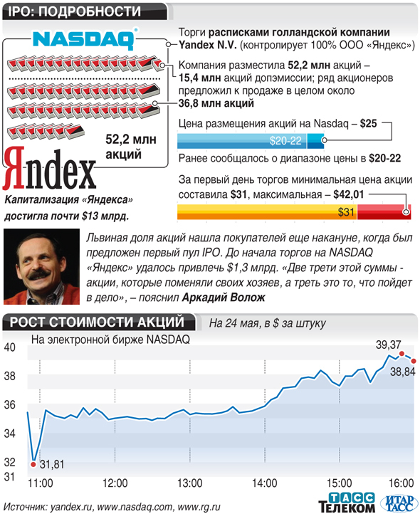По окончании первого дня торгов на американской фондовой электронной бирже Nasdaq акции крупнейшего российского интернет-поисковика "Яндекс" выросли в цене на 55%