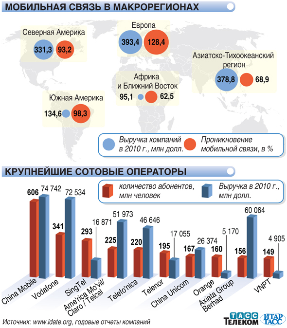 Аналитическая группа ТАСС-Телеком подготовила рейтинг крупнейших сотовых операторов мира по объему выручки от услуг мобильной связи в 2010 г. и по размеру абонентской базы