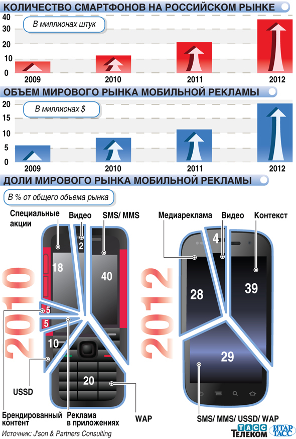 Компания J’son & Partners Consulting опубликовала исследование российского и мирового рынков мобильной рекламы и маркетинга. Согласно исследованию, в будущем ключевые каналы доставки рекламы будут определяться динамично растущим рынком смартфонов.