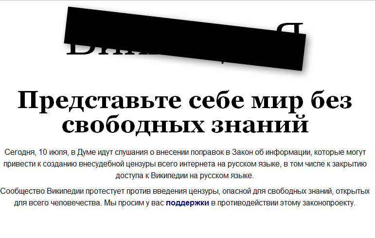 МОСКВА, 10 июля. /ИТАР-ТАСС/. Wikipedia на русском языке "10 июля будет закрыта по решению сообщества в знак протеста против предлагаемых поправок к закону "Об информации", второе чтение которых проходит в этот день в Госдуме", - говорится в обращении администрации интернет-энциклопедии.