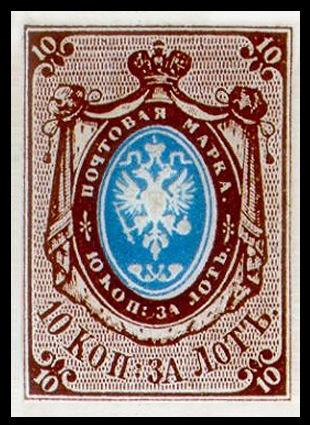 В центре марки на внутреннем голубом овале изображен герб Почтового департамента, рамка выполнена в темно-коричневом цвете. Марка была лишена зубцов – специальной перфорации, облегчающей отделение марок друг от друга.