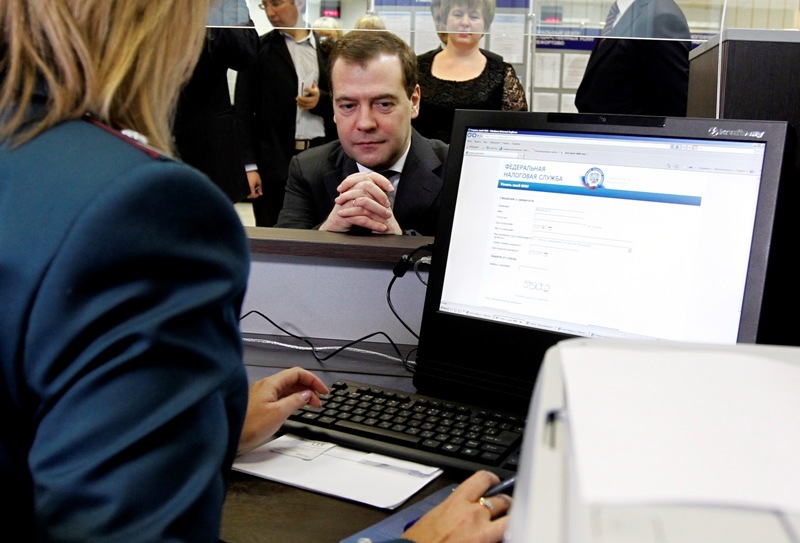 Глава правительства подошел и к окну налоговой службы, чтобы проверить отсутствие собственной задолженности по налогам. Буквально через две минуты сотрудница МФЦ выдала ему соответствующее уведомление. "Какая радость - задолженность отсутствует", - озвучил результат Медведев.