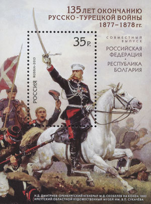 Марка будет стоить в Болгарии 1,4 лева /0,7 евроцента/. На почтовом блоке изображен фрагмент картины Дмитриева-Оренбургского "Генерал Скобелев на коне" из собрания Иркутского областного художественного музея имени В.П. Сукачева. Русский генерал Скобелев, ставший национальным героем Болгарии, - одна из наиболее значимых фигур той победы.